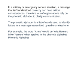 Yet many people are not aware that it was on the military side, the united states adopted a joint army/navy phonetic alphabet, called the able baker alphabet after the first two code words. See more ideas about phonetic alphabet, nato phonetic alphabet, alphabet list. Furthermore, because the concept behind them is simple and intuitive, these alphabets can be learned quickly and easily. Translates the normal alphabet into the phonetic alphabet used in the military. Ipa is a phonetic notation system that uses a set of symbols to represent each distinct sound that exists in human spoken language. It's also used by the military and police, by phone technicians, businesspeople and everyone in between. The nato phonetic alphabet, also sometimes referred to as alpha bravo charlie is actually officially called the international radiotelephony spelling alphabet. The term nato alphabet was adopted prior to the cold war as an alternative name for the icao phonetic alphabet, after it was used in a publication for the navies of all nato members. The nato phonetic alphabet is what people used during ww2 to make sure they didn't do something dumb because they misheard the orders through the radio, and is now more commonly used to make sure your name isn't misspelt when trying to set up a new account for your gas and electricity bills. Today, the nato phonetic alphabet is used for radio communication by aviation and maritime industries. In addition to the 26 code words that are assigned to the english letters, the nato. I printed this page, cut out the table containing the nato phonetic alphabet (below), and taped it to the side of my computer monitor when i was a call center help desk technician. The nato phonetic alphabet has a variety of applications, most of these relating to safety.
